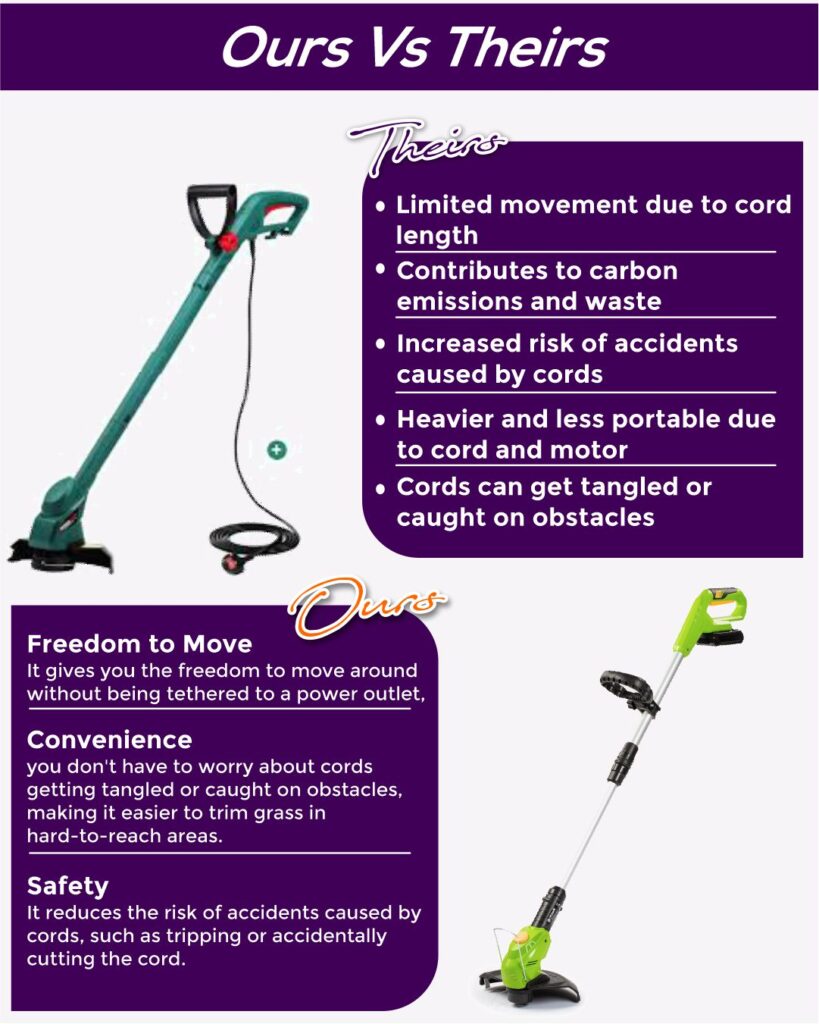 Unlike the olden days bulky grasscuuters, Our Powertrimmer has fewer moving parts, meaning less loads to carry around & less money to spend on maintenance